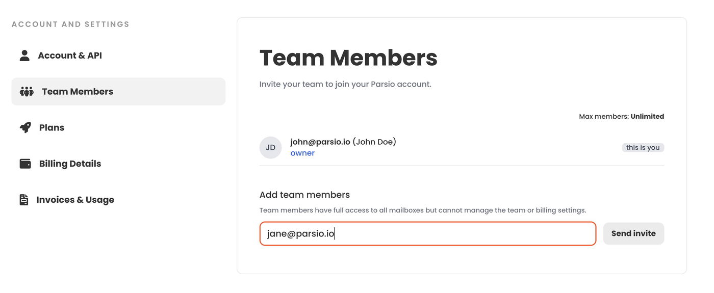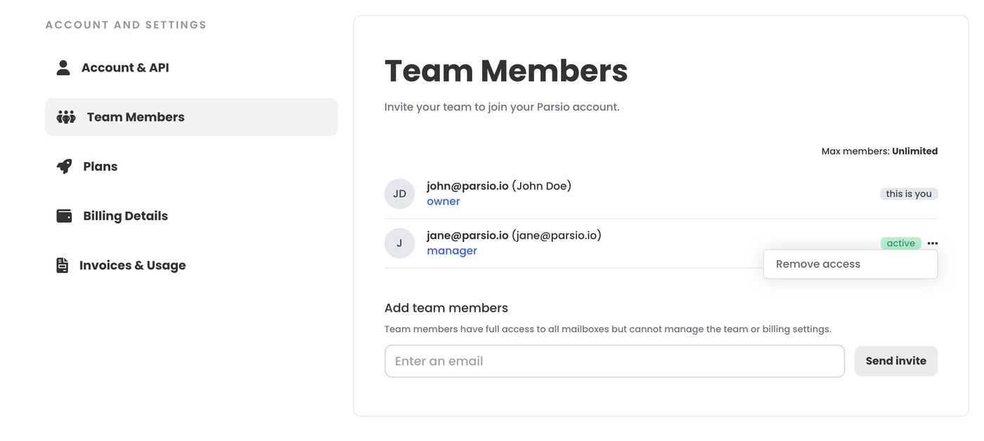 Managers can create and edit inboxes and parse documents. However, unlike account owners, they cannot access or modify billing details, add or remove credit cards, change subscription plans, or invite or remove team members.