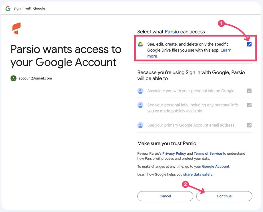 Please check the box shown below when adding your Google account. This permission is required for Parsio to export data to your Google Sheets.