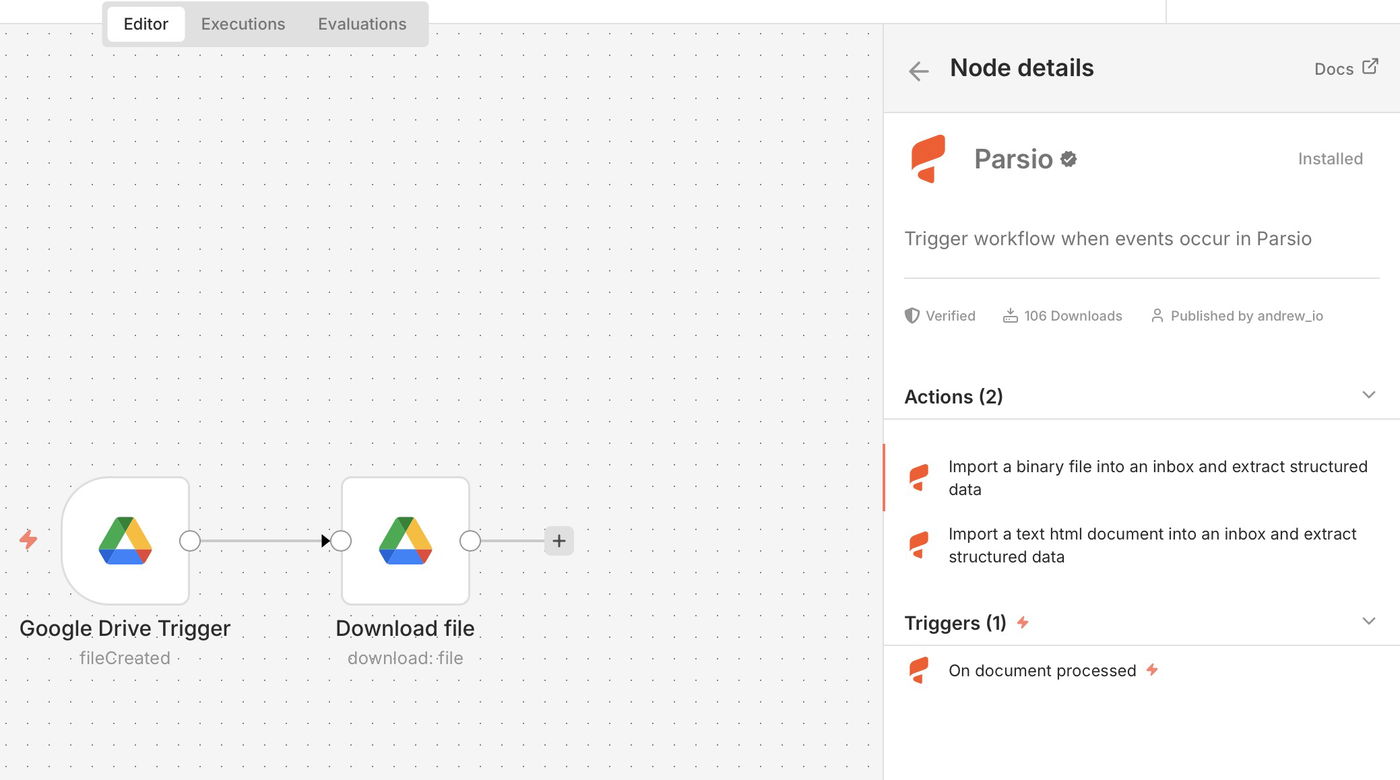 Parsio offers an official n8n integration that helps you automate document parsing and route extracted data to other apps and workflows.