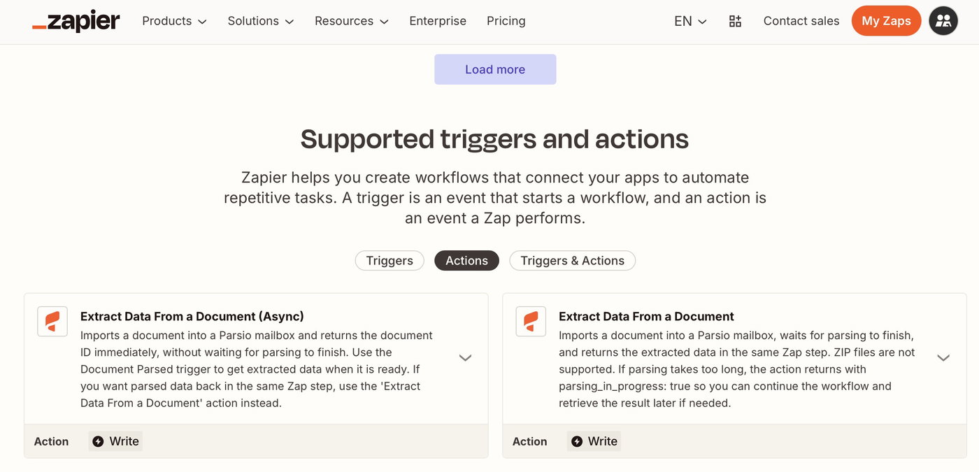 Zapier lets you connect Parsio to thousands of other web services. Automated workflows called Zaps help you move data between apps without coding, so you can trigger follow-up actions as soon as Parsio receives or parses a document.