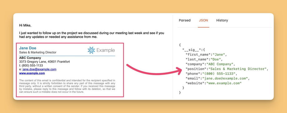 Parsio's email signature parsing feature is a powerful tool that can help you extract key contact information from your emails. We use AI to identify and extract the following fields from email signatures:
