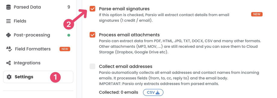 You can activate the email signature parsing in your mailbox settings. The feature costs 1 credit per extraction, regardless of whether a signature is found or not. However, if you re-parse a document, you won't incur any additional credits for signature extraction.