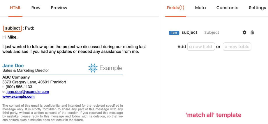 This means that your email should be parsed by a template in order for the signature extraction to work. If you want to extract signatures from all incoming emails, you can create a simple template with one field capturing the word 'Subject'. This template will match all incoming emails. You can also combine this 'match all' template with other parsing templates in your mailbox.