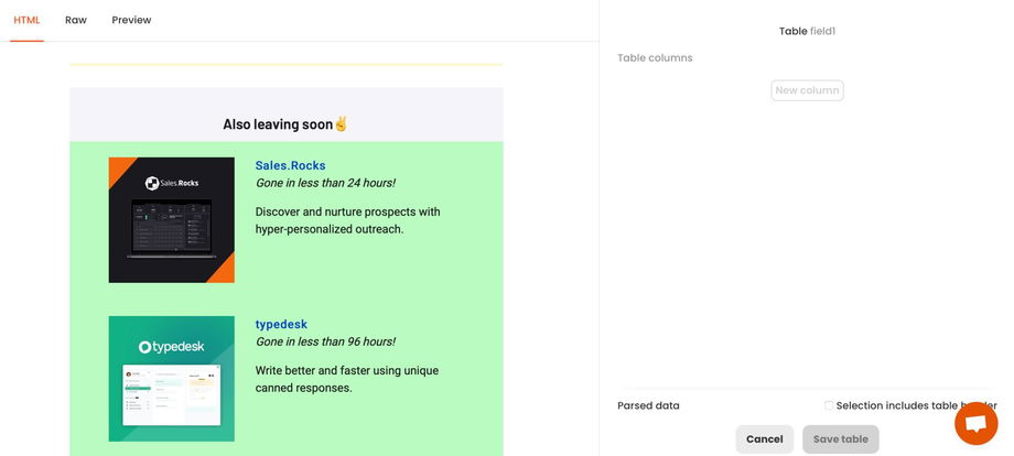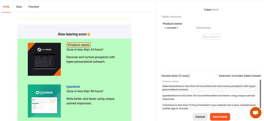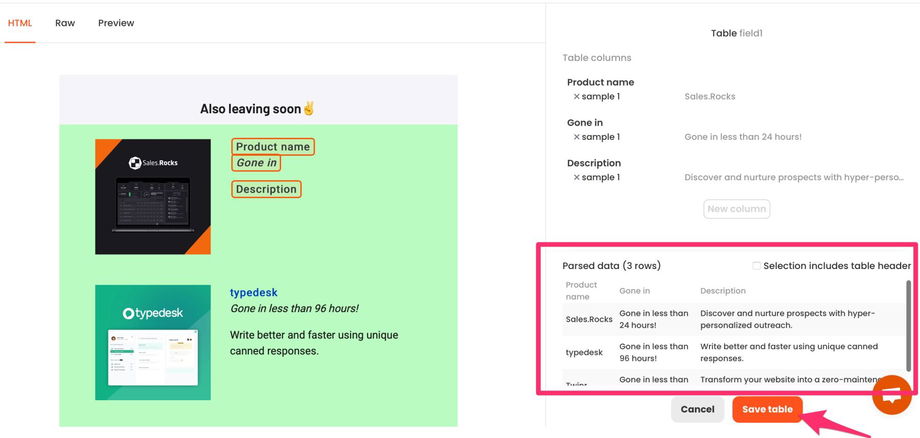 Have a look at the "Parsed data" section. In our example the result is just as it should be, but in more complex cases you might need to help Parsio understand the table structure better. To do this, just highlight some more fields with the product name, "gone in" label and product description and add them to the "Product name", "Gone in" and "Description" columns we already have. Thus Parsio will understand better the table structure.
