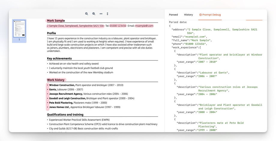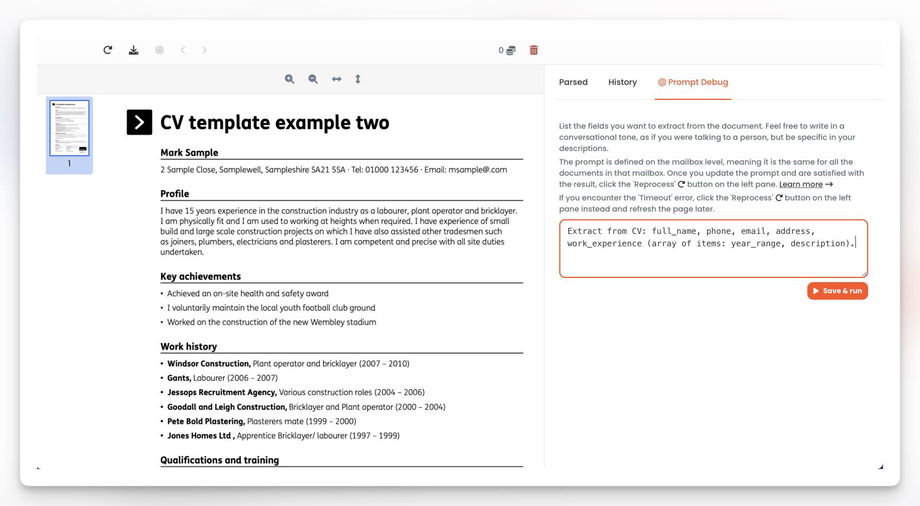 3. Open the "Prompt Debug" tab and write a prompt. In our case, we will write: Extract from CV: full_name, phone, email, address, work_experience (array of items: year_range, description).