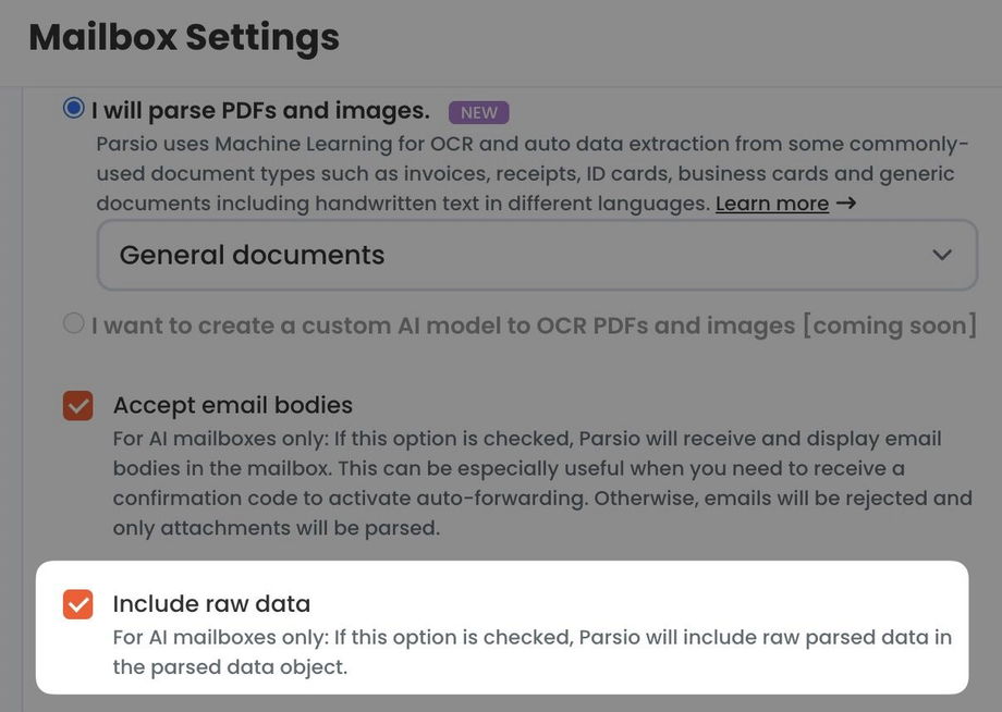 By default, Parsio only includes structured data based on the document type. However, customers can choose to include raw data by enabling it in the mailbox settings.