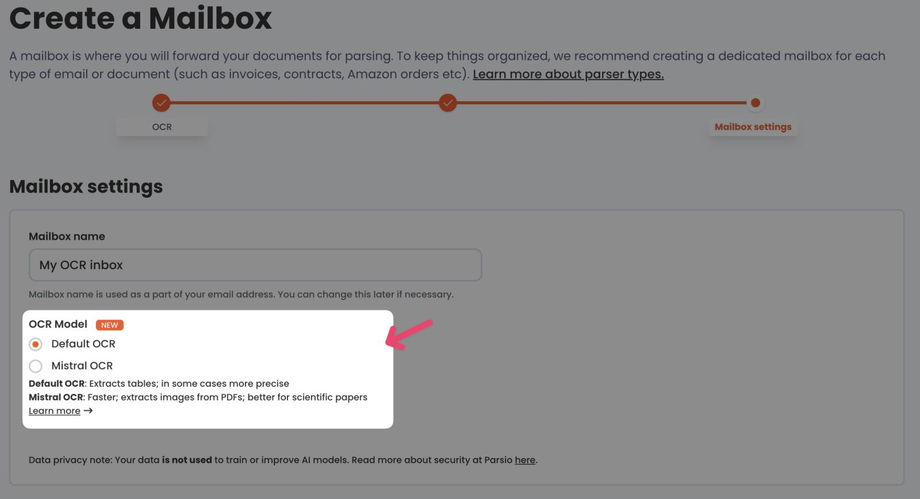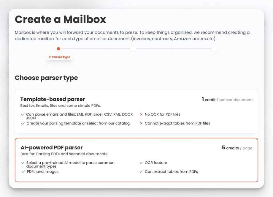 1. Create a mailbox, choose "AI-powered PDF parser" and select a pre-built model.