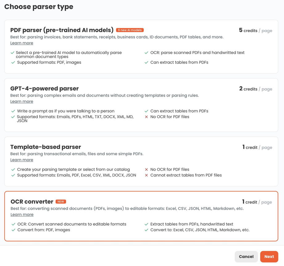 Parsio currently supports two AI-powered OCR models, each optimized for different use cases.