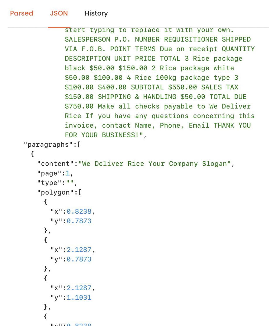The raw data is stored in in the __raw__ field , which consists of the fully extracted content in plain text and an array of paragraphs with associated attributes such as page number, type (title, footer, etc.), and polygon (coordinates of the paragraph on the page).
