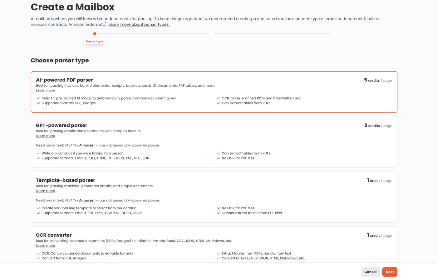 This parser uses pre-trained AI models to extract data from common document types such as: