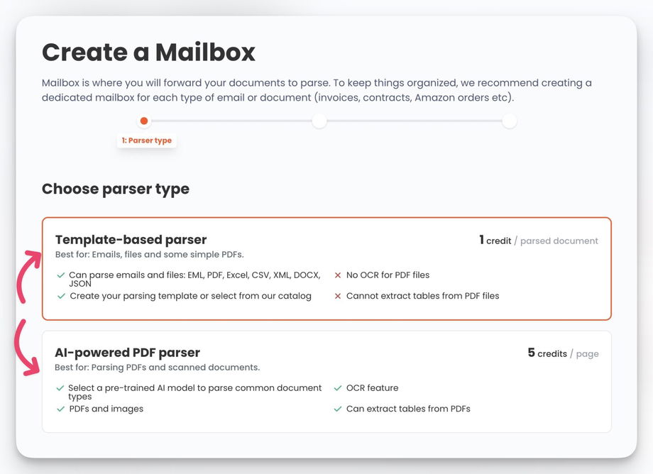 Parsio has 2 parser types that can process PDF files, in different ways.