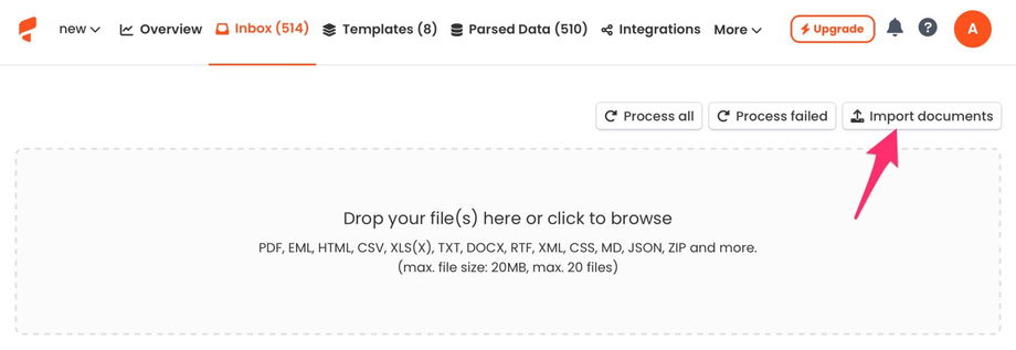 One of the ways of sending documents to Parsio is uploading them via the “Import documents” button in the up right corner of your Inbox tab.