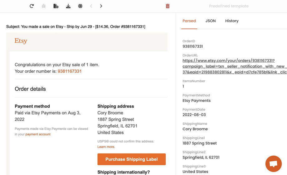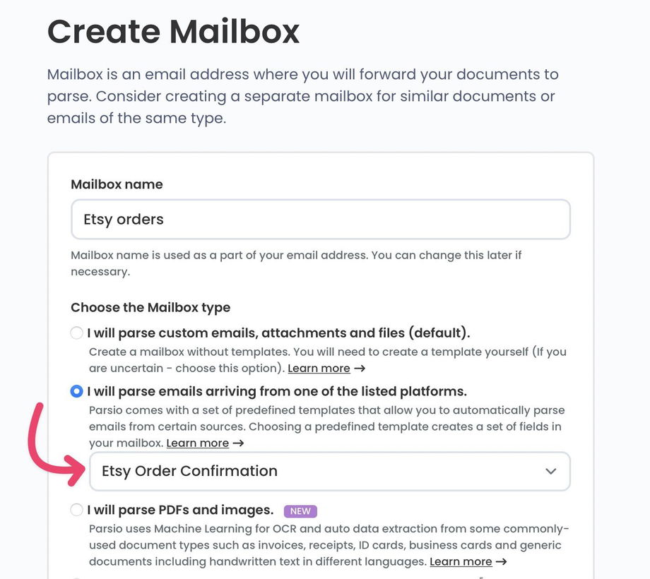 To activate the predefined template, choose "Etsy Order Confirmation" while creating a new mailbox or later from the Mailbox Settings page: